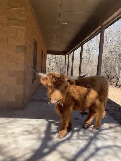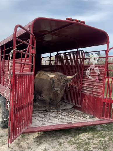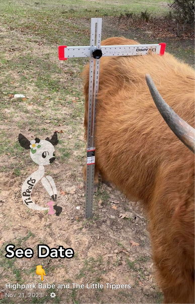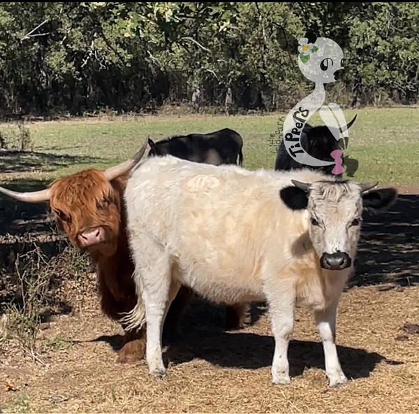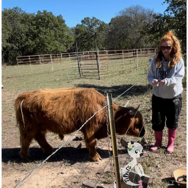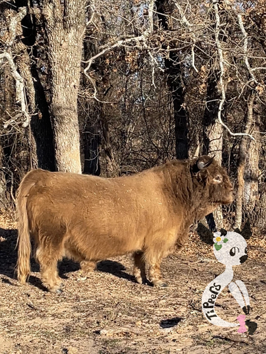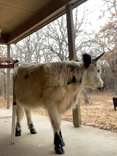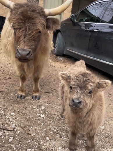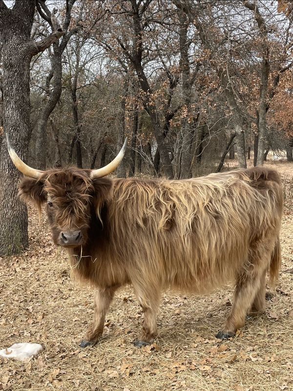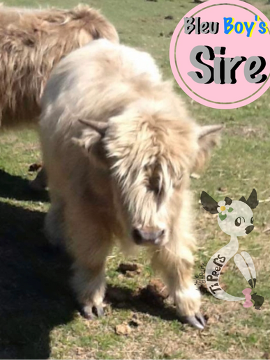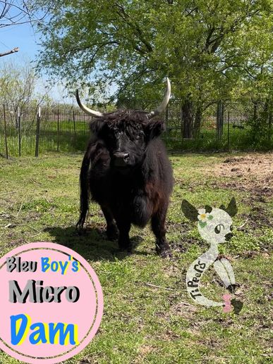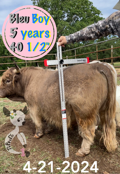 Bleu Boy is a Chondro positive high percentage mini highland,purchased from ‘Miniature Cattle at Carrousel Country Miniatures’. He’s over 6 years old, measured at 40” in April,2024. His ears are slightly flat at the tips due to crop ear. Bleu Boy’s genetic line has micro-sized genes that comes through when paired with a Dam who also has miniature genetics in her making. When both genes are expressed ,a micro fluffy calf is born. His genetic line has proven to produce them from time to time over the years at his previous ranch. Because of that, mild crop ear is a nonissue.