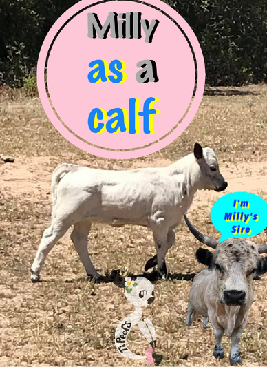 Milly was born July 3,2020. Her sire is Highpark Babe. Babe is also Chip the Teeny Tiny Highpark’s Sire. She’s had 3 calves so far.. Luke,Apple,Holly.