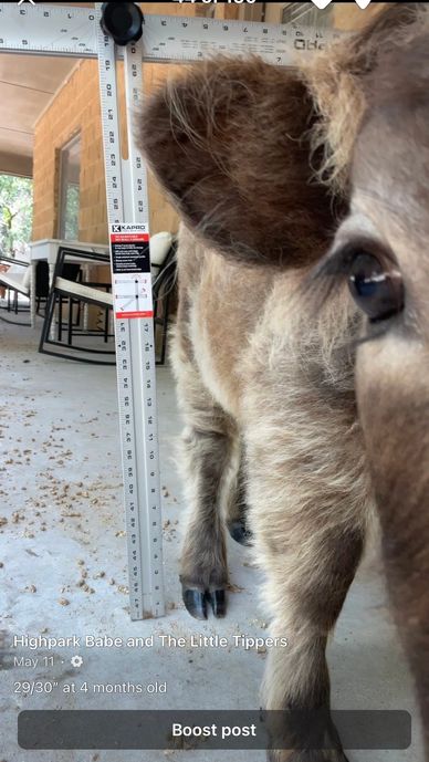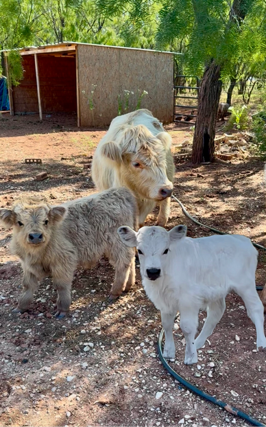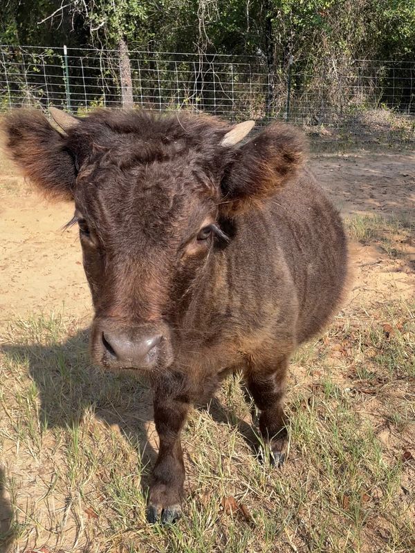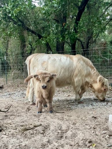 Birthdate: January 8,2025. Chondro+, Dunn highland heifer cross. Her higher price tag is reflected from her micro/mini size while maintaining her highland appearance. She,like all the chondro+ ones available, are easy keepers and very people friendly.