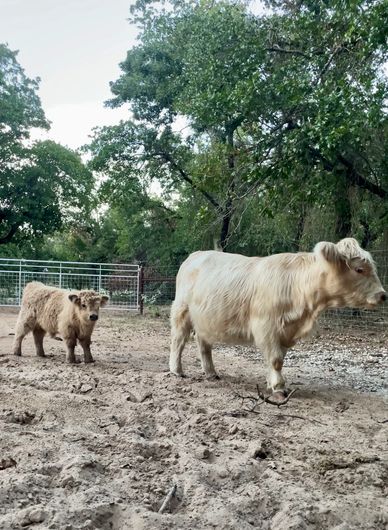 Claire is a larger mid-sized white park marked cow.She has more fluff then a white dexter and less then a first generation Highpark. She‘s 4 years old,people friendly and heavily bred to a dun highland. Strong maternal instincts ,easy births and this will be her 3rd calf. Take a chance for a possible fluffy Highpark calf!